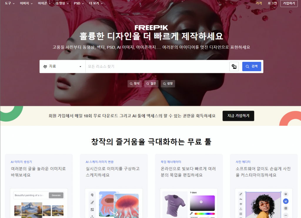 Freepik은 이미지, PSD, 일러스트 등 다양한 무료 리소스를 제공하며, 유료 상품 이용도 가능합니다. 또한 웹사이트, 소셜 게시물, 애니메이션 제작을 지원하는 등 다양한 기능을 갖추고 있습니다.
