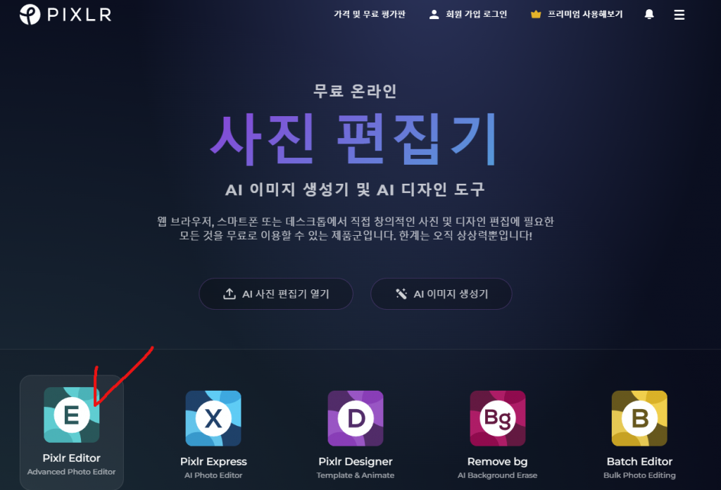 pixlr editer 버튼을 선택해서 사용하시면 됩니다. UI가 포토샵과 매우 비슷하고 따로 설치하지 않아도 되고 웹으로 접속해서 바로 작업할 수 있어서 간단한 작업 할땐 요긴합니다. 개인적으로 사용하는 것이기도 합니다.