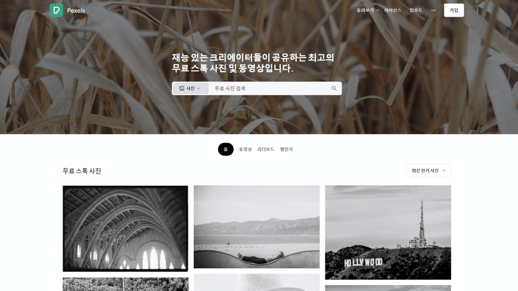 Pexels는 한국어를 지원하여 편리하게 이용가능하며 저작권 제약이 없는 고품질의 무료 사진과 동영상을 제공합니다. 다만 일러스트레이션는 제공하지 않습니다.
