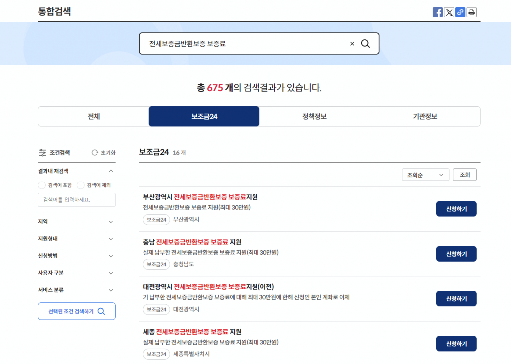 검색에 ‘전세보증금반환보증 보증료’ 라고 검색하시면 각 지역별로 검색이 됩니다.