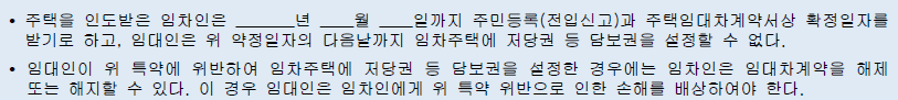 임대인의 대항력을 보장 받을 수 있는 특약사항입니다. 임대인은 약정일자 다음날까지 임차주택에 저당권 등 담보권을 설정 할 수 없습니다. 확정일자는 다음날 12시부터 효력이 발생한다는 점을 이용해서 그 사이에 돈이 부족한 집주인이 담보권을 설정하는 불미스러운 일들이 있었습니다. 고의든 아니든 그렇게되면 집이 경매에 넘어갔을때 우선순위에서 밀려서 보증금을 받지 못하는 경우도 있었는데, 그렇게 하지 못하도록 이 부분을 특약으로 명시해놓았습니다. 더불어 위반시 손해배상까지 받을 수 있습니다.